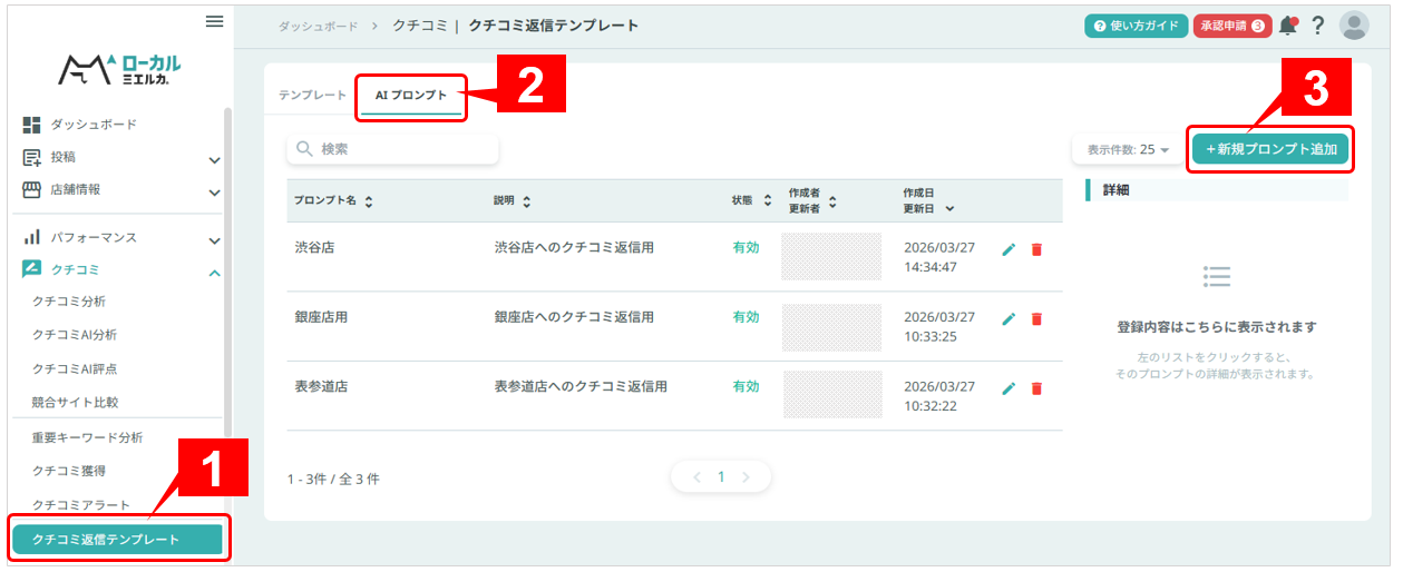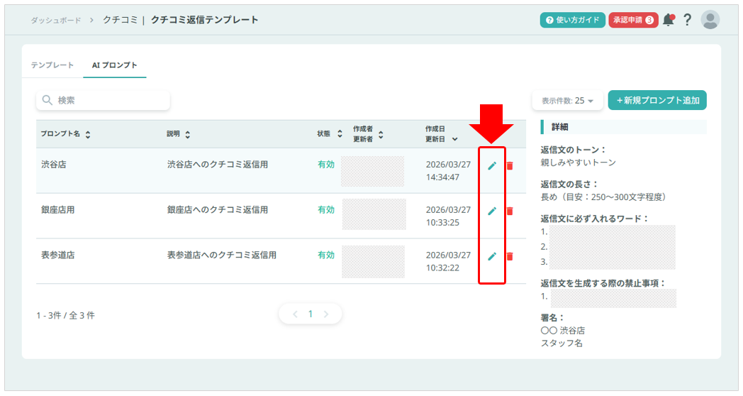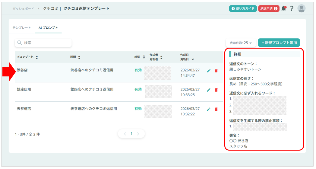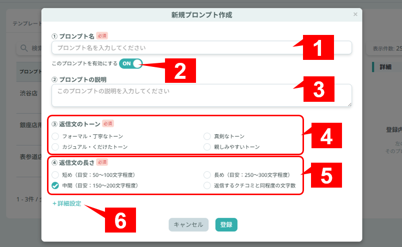 クチコミ返信文をAIで生成する際、予めその生成条件(プロンプト)を作成し登録しておくことができます。