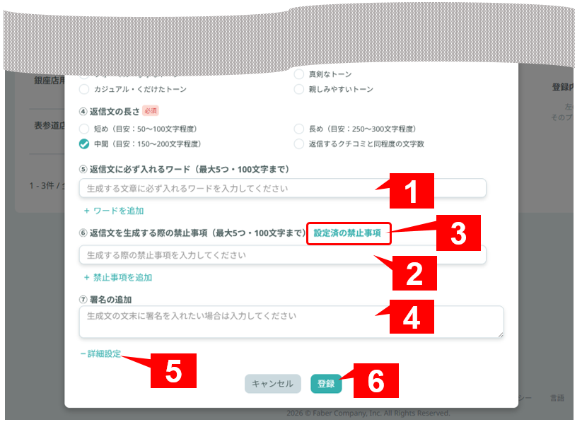 - 返信文を生成する際の禁止事項を設定します。こちらも1つにつき100文字まで、最大5つ設定できます。