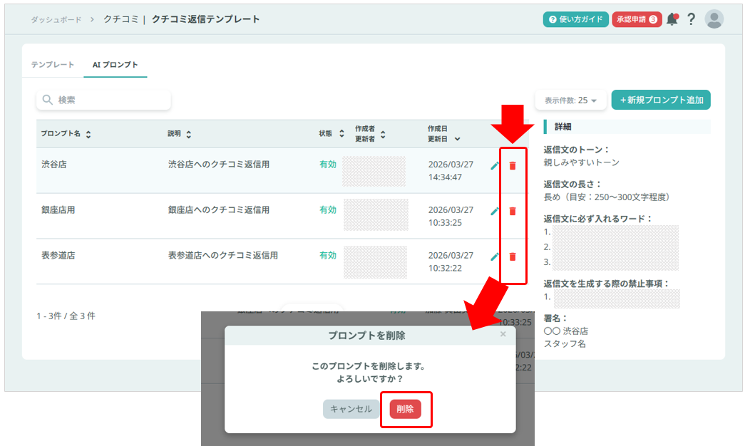 ※「有効」状態のプロンプトは削除ができません。先に「無効」状態にしてから削除してください。