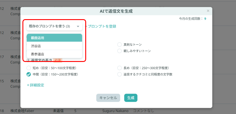 登録したプロンプトは返信文を生成する際に呼び出すことができるため、実際の返信文生成作業をスムーズに進めることができます。