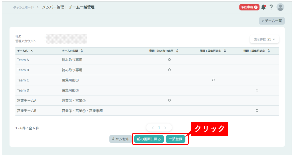 一括登録が完了すると、チーム一覧の画面に戻ります。