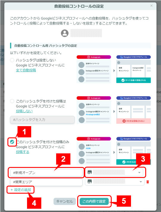 - 特定ハッシュタグを付けた投稿のみGoogleビジネスプロフィールに投稿する(店舗単位でハッシュタグの設定可)