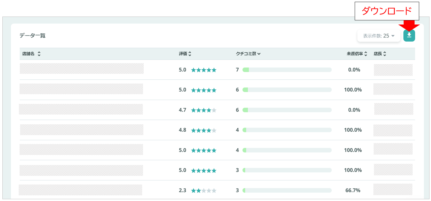 店舗ごとに「評価★数」「クチコミ数」「未返信率」を確認することができます。