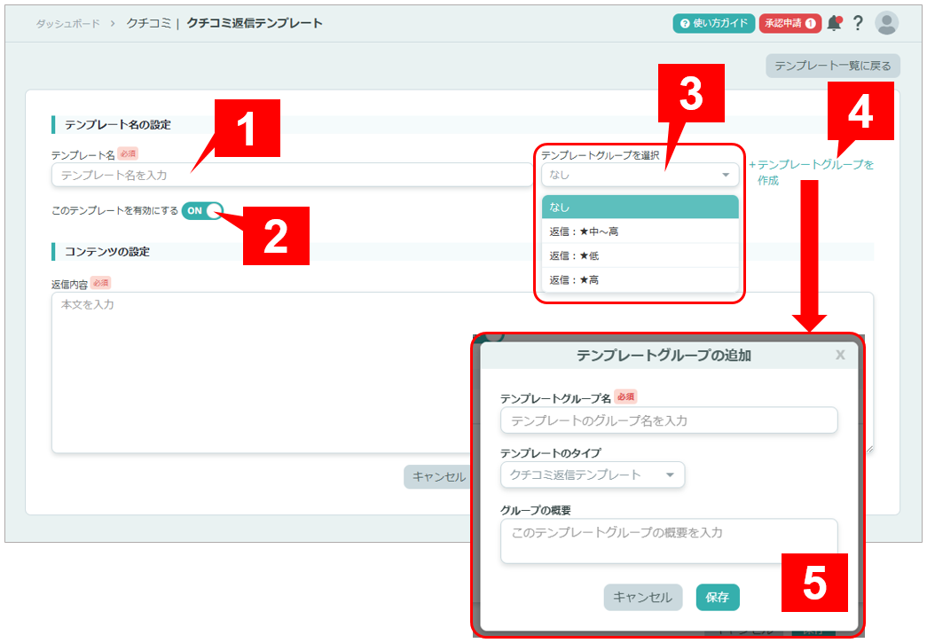 予め評価★数やクチコミの内容に合わせてテンプレートを設定しておくことで、実際のクチコミ返信作業をスムーズに進めることができます。