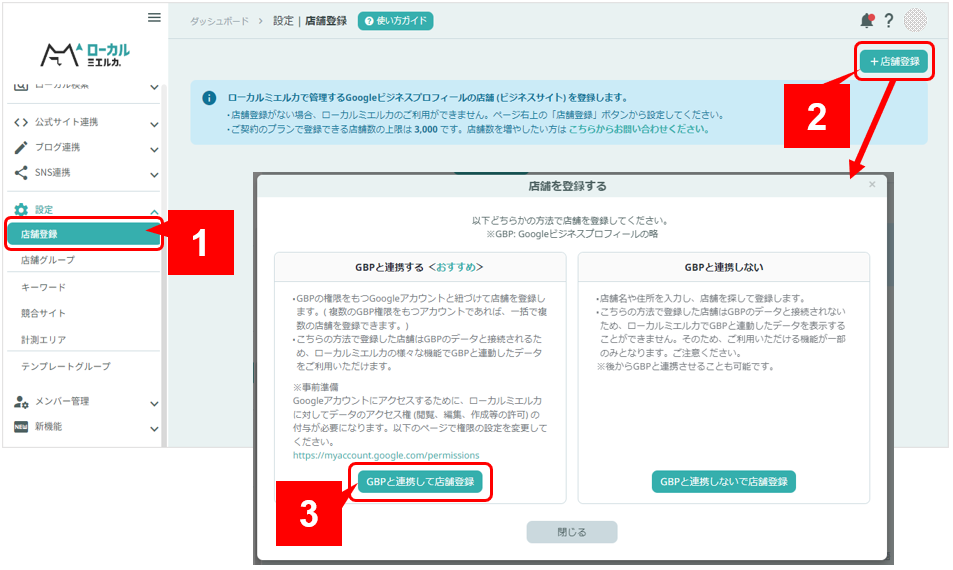 店舗の登録には、「GBPと連携して登録」する方法と「GBPと連携しないで登録」する方法の2つがあります。後者で登録した場合、店舗とGBPのデータが接続されないため、ローカルミエルカでGBPと連動したデータを表示することができません。GBPと連携して登録することをお勧めします。