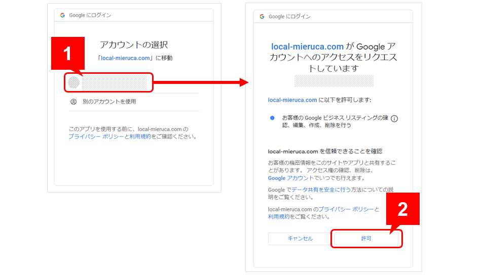 2. ローカルミエルカからGoogleアカウントへのアクセスの許可を求められるので「許可」をクリックします。